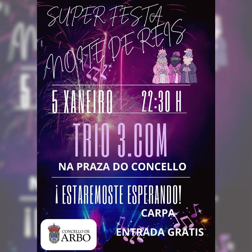 Como principal novedad, el Concello de Arbo organiza por primera vez una Fiesta de Reyes nocturna, que comenzará a las 22:30 horas en una carpa instalada en la Praza do Concello, con la actuación del trío 3.Com y entrada gratuita.