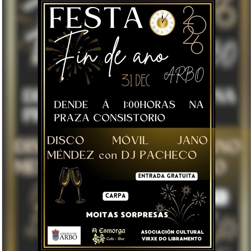 El Concello de Arbo se prepara para despedir el 2025 con una celebración inolvidable. La Praza Consistorio será el epicentro de la fiesta de fin de año, que dará comienzo a la una de la madrugada y se prolongará durante toda la noche.