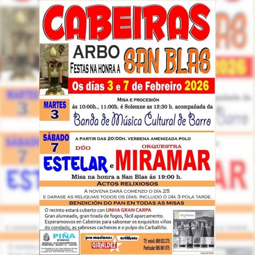 La parroquia de Cabeiras, en el municipio de Arbo, se prepara para celebrar las tradicionales Fiestas de San Blas, un evento que combina devoción, música y diversión para toda la comunidad. El recinto donde se celebrará la fiesta contará con una carpa, fuegos artificiales y facilidades para el aparcamiento.