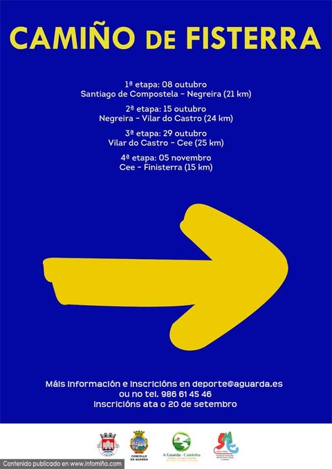 Esta actividade supón a continuación da peregrinación de Caminha ata Santiago de Compostela que máis de 100 veciños da Guarda e Caminha realizaron durante os primeiros meses de 2016. Desta volta o percorrido será dende Santiago ata Fisterra en catro etapas, que se realizarán os vindeiros catros sábados de outubro. En todas as etapas a hora de saída é ás 7.30 h dende a explanada do CEIP A Sangriña. O encontro cos participantes de Caminha e Viana do Castelo en Goián ás 8.00 h.