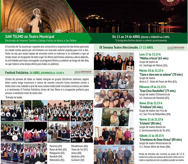 Centos de persoas de todas as idades integran os grupos folclóricos tudenses, algúns deles cunha longa traxectoria e outros de recente creación. Coma elemento común a todos está o seu traballo a prol da nosa cultura tradicional vinculada á música, aos bailes e á vestimenta. O Festival Folclórico festas de San Telmo é o escaparate perfecto para amosar o excelente nivel de todos eles, realizaráse o domingo, 16 de abril, ás 18h. con entrada de balde. Participan os grupos Laxes de Paramos, Inquedanzas de Pazos de Reis, O Mosteiro de Pexegueiro, Xuntanza de Randufe, San Fins de Rebordáns, Santa Columba de Ribadelouro, Asociación C.X.D do Traxe de Tui, Seixos Albos de Areas, Refaixos e Polainas de Baldráns e Lembranzas da Terra de Guillarei.