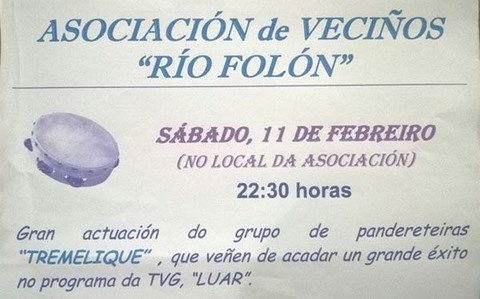 O vindeiro sábado 11 de febreiro a Asociación de veciños Río Folón de Fornelos, contará coa actuación das Panderereteiras Tremelique.