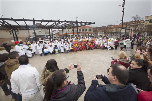 Arredor de 130 alumnos e alumnas do CRA desfilaron disfrazados de lume, en todos vermellos, laranxas e amarelo, mentres que os 210 representantes do Pedro Caselles elixiron como temática dos seus disfraces a ciencia. Entre os rapaces e rapazas había experimentos, científicos tolos, disfrazados de Einstein... que encheron sobre todo de blanco as rúas do centro de Tomiño.