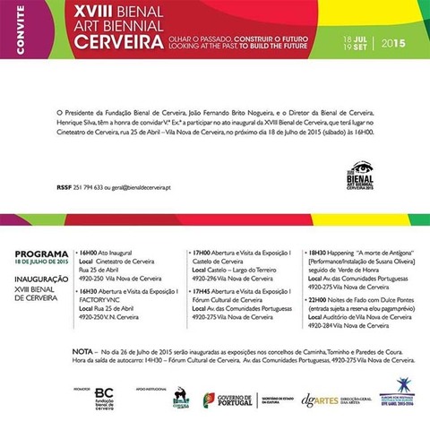 O Presidente da Fundação da Bienal de Cerveira, João Fernando Brito Nogueira, e o Diretor da Bienal de Cerveira, Henrique Silva, têm a honra de convidar V.ª Ex.ª a participar no ato inaugural da XVIII Bienal de Cerveira que terá lugar no Cineteatro de Cerveira, Rua 25 de Abril - Vila Nova de Cerveira, no próximo dia 18 de julho de 2015 (sábado), às 16h00.