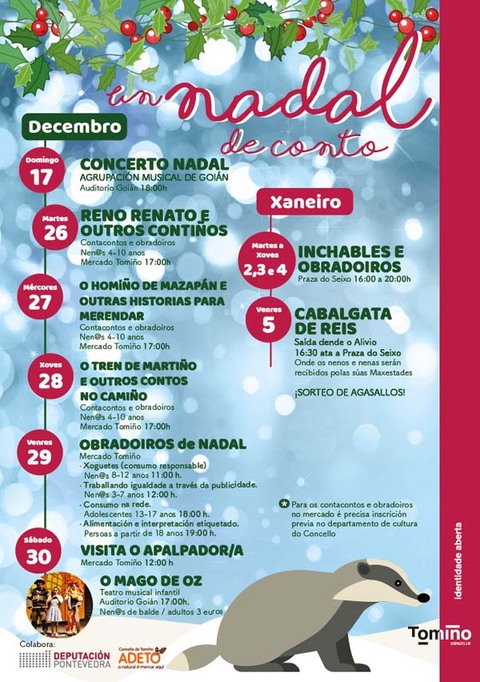 O Nadal está a volta da esquina e Tomiño comeza a preparar todo para que os máis pequenos e pequenas da casa poidan gozar de tempo de lecer, sos ou acompañados das súas familias. Tras o arranque do programa de Nadal co tradicional concerto da Agrupación Musical de Goián este pasado domingo, as actividades retomaranse o vindeiro 26 de decembro co inicio de contacontos para nenos e nenas e de obradoiros para todas as idades no Mercado de Tomiño.