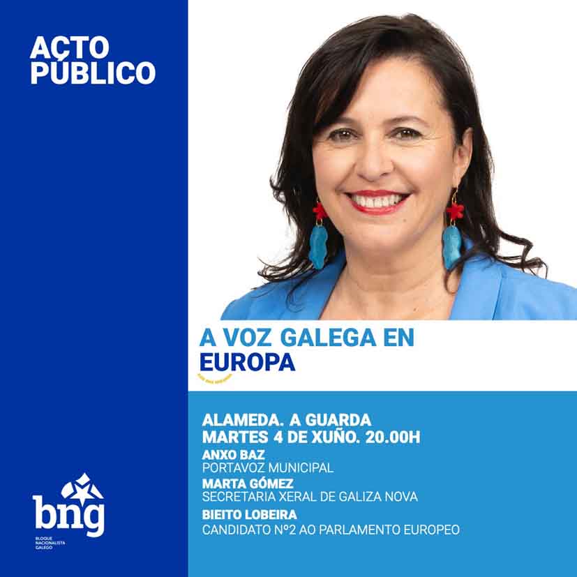 El Bloque Nacionalista Galego (BNG) invita a toda la comunidad de A Guarda a participar en el acto central de su campaña para las elecciones europeas, que tendrá lugar el próximo martes 4 de junio a las 20:00 horas en la Alameda de A Guarda. Este evento, clave en la campaña del BNG, contará con la participación destacada de Bieito Lobeira, candidato número 2 al Parlamento Europeo.
