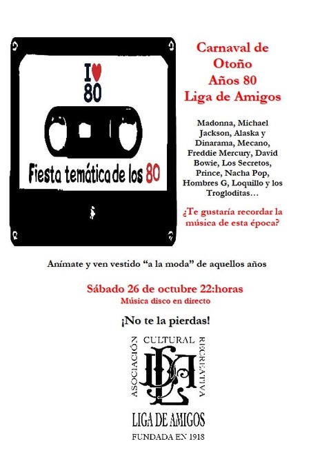 El próximo 26 de Octubre, a las 22 horas, celebraremos el Carnaval de Otoño que estará dedicado a los años 80.