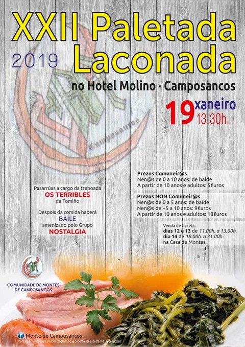 El próximo sábado día 18 de enero de 2019 se celebrará en el Hotel Molino de Camposancos la XXII edición de la Paletada-Laconada de San Amaro, un evento organizado por la Comunidad de Montes de Camposancos y que reune cada año a cientos de comensales entorno a esta oferta gastronómica.