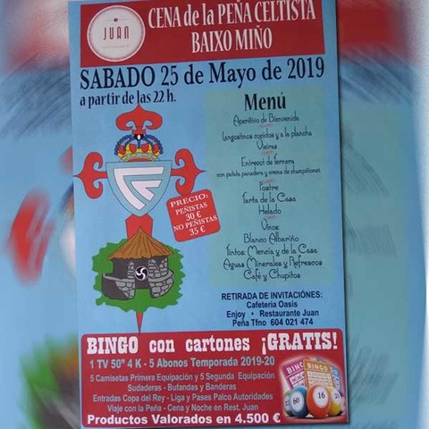 El día 25 de mayo la Peña Celtista Baixo Miño realiza una cena-bingo por fin de temporada en el Restaurante Juan con cartones gratis para el bingo.