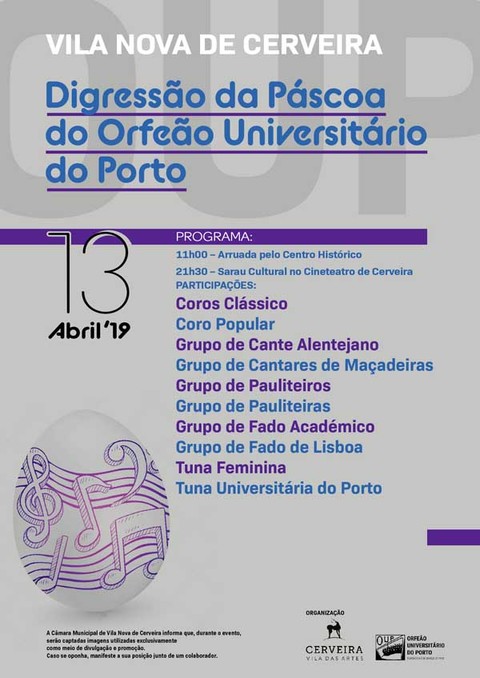 Treze anos após ter escolhido Vila Nova de Cerveira pela primeira vez para a habitual Digressão da Páscoa, o Orfeão Universitário do Porto está de regresso à ‘Vila das Artes' para presentear os Cerveirenses com um espetáculo único, repleto de música, dança e humor, privilegiando o canto, a etnografia e as manifestações culturais académicas nacionais. Além de visitar os lares de idosos do concelho e de algumas arruadas pelo centro histórico, o arranque da digressão fica marcado com um Sarau Cultural dirigido ao público em geral, agendado para este sábado, 13 de abril, no Cineteatro de Cerveira, às 21h30.