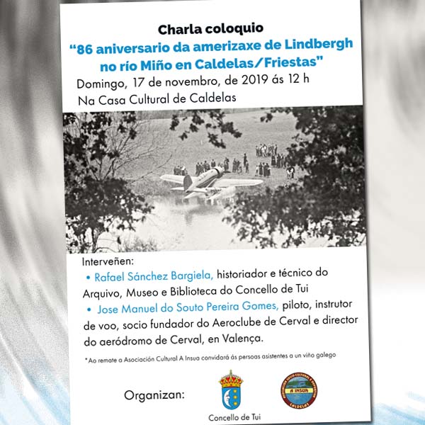 A Casa Cultural de Caldelas acolle este domingo, 17 de novembro, ás 12 h a charla coloquio "Lindbergh en Caldelas", cando se cumpren 86 anos do amerizaxe do aviador norteamericano no río Miño.