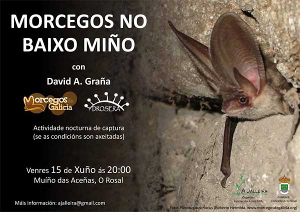 O venres 15 de xuño, ás 20:00 h, temos unha charla sobre os morcegos no Baixo Miño con Daví Álvarez Graña, membro do colectivo Morcegos de Galicia. Se as condicións nos acompañan, faremos unha actividade nocturna de captura de morcegos, !!preparade as lanternas!!