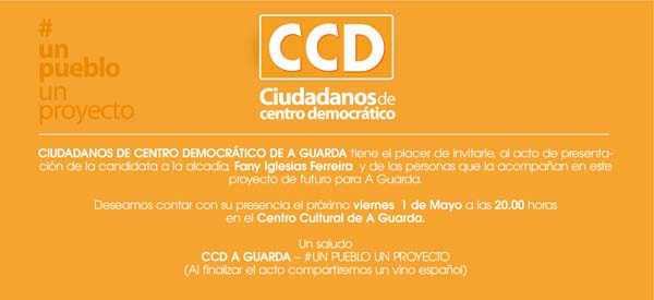 Ciudadanos de Centro Democrático de A Guarda celebrará el acto de presentación de la candidatura que se presenta a las elecciones municipales del 24 de Mayo, este viernes día 1 de Mayo a las 20:00 horas en el Centro Cultural de A Guarda.