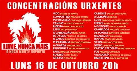 Convocatoria de concentración en repulsa por los incendios que han afectado a Galicia en los últimos días este Lunes día 16 de octubre a las 20:00h en la Plaza do Reló de A Guarda y Praza do Seixo de Tomiño.