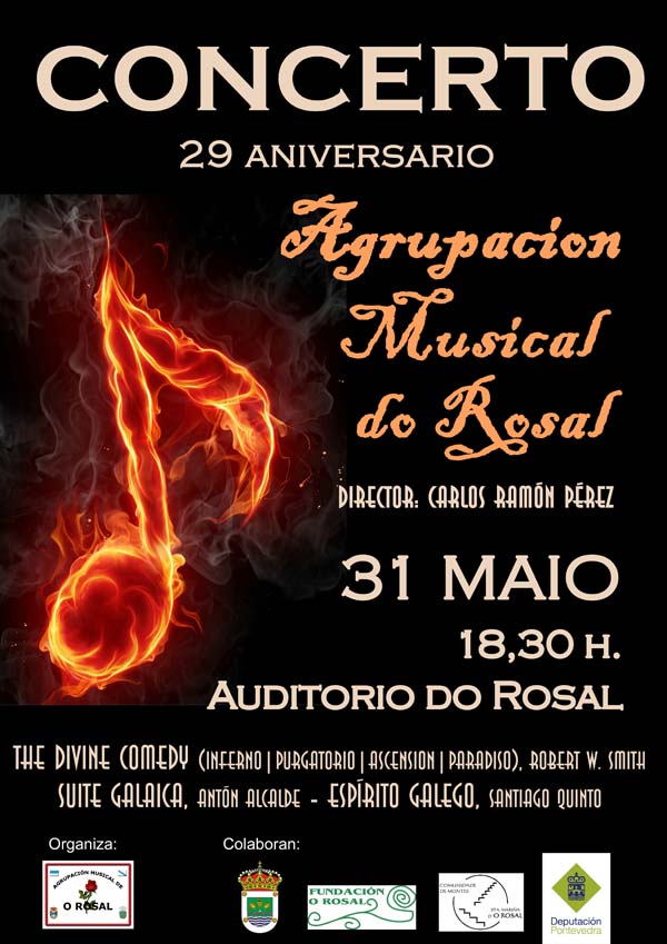 Con motivo do 29º aniversario a Agrupación Musical do Rosal ofrecerá un concerto este vindeiro domingo día 31 de maio ás 18,30 h. no Auditorio do Rosal, baixo a dirección de Carlos Ramón Pérez.