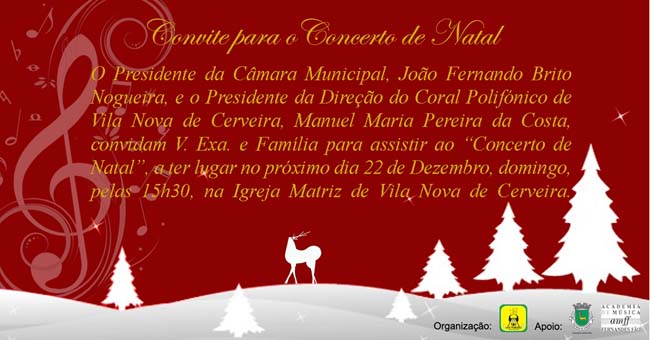 Vai realizar-se no próximo domingo, dia 22 de dezembro, o tradicional Concerto de Natal, uma organização do Coral Polifónico de Vilanova de Cerveira, que conta com o apoio da Câmara Municipal. Terá lugar na Igreja Matriz, pelas 15h30. Participam a Academia de Música Fernandes Fão, o Coro Infanto-Juvenil de Vila Nova de Cerveira e o Coral Polifónico de Vilanova de Cerveira.