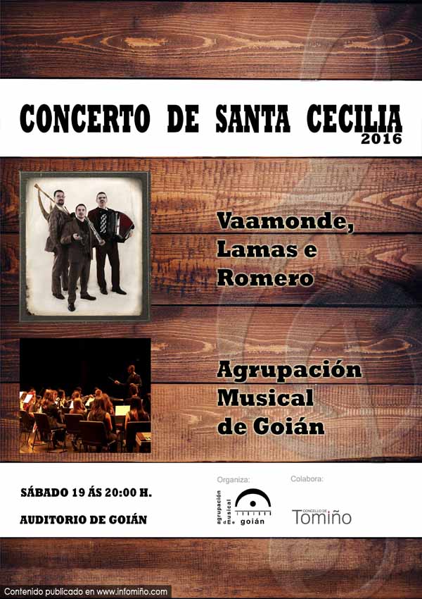 O próximo sábado 19 de Novembro ás 20:00 h. celebrarase no auditorio de Goián o tradicional concerto de Santa Cecilia da Agrupación Musical de Goián baixo a batuta de Pedro Villarroel González. Este ano, como novidade, farao acompañando ao trío "Vaamonde, Lamas e Romero".
