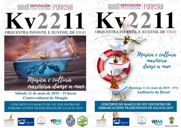 A Orquestra Infantil e Xuvenil de Vigo, Kv2211, actúa este sábado 11 de maio de 2019, as 19:00 horas na Casa da Cultura de Mougás e o domingo 12 de maio, as 19 horas, no Auditorio do Rosal, dentro dos actos programados pola Asociación Piueiro con motivo da celebración do XIV Encontro de Embarcacións Tradicionais que terá lugar do 11 ao 14 de xullo en A Guarda. Estes concertos da Orquestra no Baixo Miño súmanse o celebrado en A Guarda o pasado mes de abril, tamén dentro das actividades culturais programadas no marco do Encontro.
