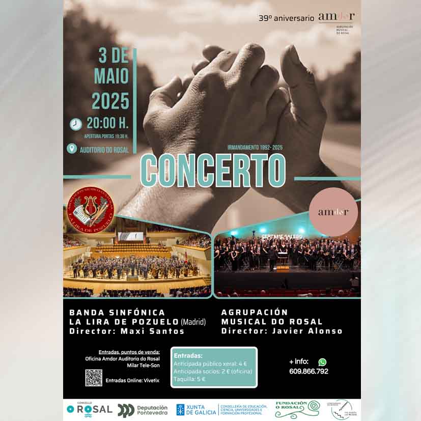 La Agrupación Musical do Rosal (AMdoR) está de celebración. Con motivo de su 39º aniversario, la banda ha organizado un concierto muy especial que tendrá lugar el sábado 3 de mayo a las 20:00 horas en el Auditorio do Rosal, y que contará con la participación de la reconocida Banda Sinfónica La Lira de Pozuelo, procedente de Madrid.