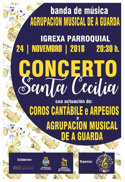 El próximo sábado día 24 de noviembre la Iglesia Parroquial de A Guarda acogerá a partir de las 20:30h el Cocnierto anual en conmemoración de Santa Cecilia, patrona de los músicos, que contará en esta edición con las actuaciones de los coros Cantábile y Arpegios, así como de la Banda de Música de la Agrupación Musical de A Guarda.