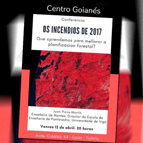 O Centro Goianés organiza o venres 12 de abril ás 20:00 horas unha conferencia de Juan Picos, director da Escola de Enxeñaría de Montes de Pontevedra da Universidade de Vigo titulada "Os incendios de 2017. Que aprendemos para mellorar a planificación forestal.