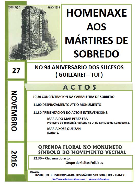 Actos de conmemoración dos sucesos de Sobredo, no seu do 94 Aniversario que se desenvolverán en Sobredo (Guillarei - Tui) o domingo 27 de novembro do 2016, a partir das 10:30 horas da mañá, aténdose ao seguinte,