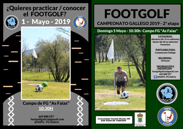 El miércoles 1 de mayo realizaremos una prueba para todos aquellos jugador@s que quieran conocer el FOOTGOLF en San Juan de Tabagón/O Rosal (As Faias). Esta jornada servirá para preparar la segunda etapa del Campeonato Gallego que se celebrará eldomingo 5 de mayo.