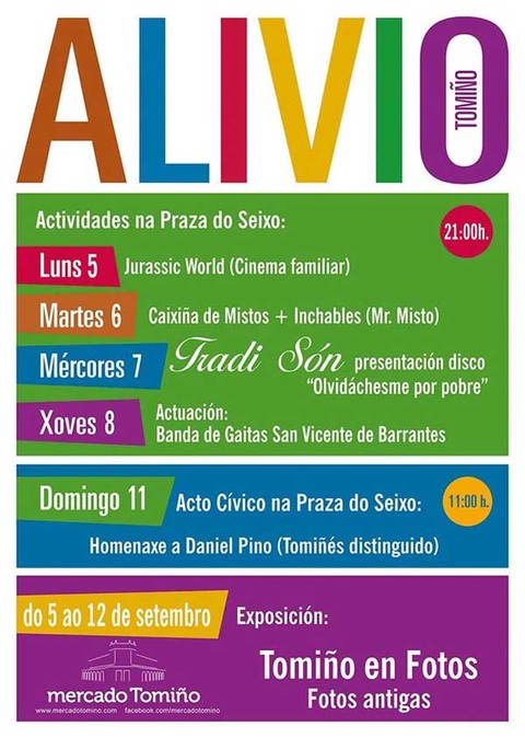 Tomiño celebra dende o luns 5 e até o vindeiro luns as festas patronais da Virxe do Alivio. A Concellalía de Cultura, que dirige Cristina Martínez, organiza un programa de actos e actividades que comeza esta noite ás 21.00 horas coa proxección de cine familiar Jurassic World, na Praza do Seixo.