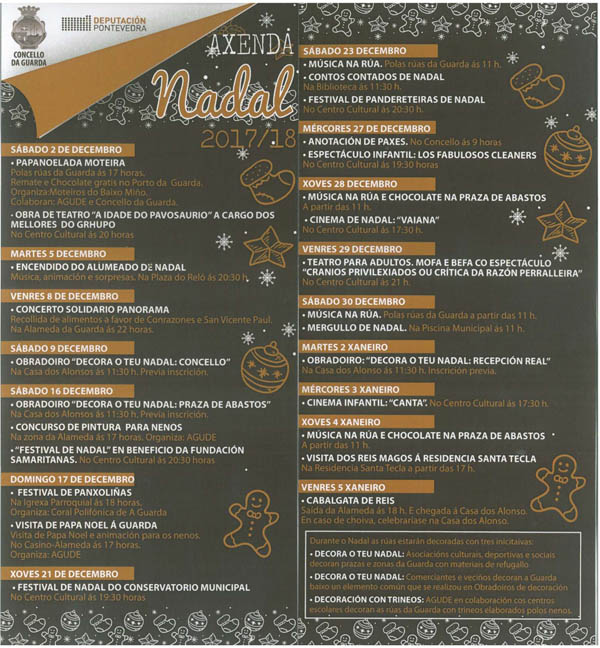 Como ven sendo habitual, o Concello da Guarda presentou a nova Axenda de Nadal 2017, que abarca a programación que se poderá desfrutar na Vila durante as próximas semanas e ata o venres 5 de xaneiro.