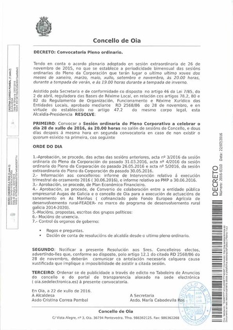 Convocatoria de Pleno Ordinario da Corporación Municipal de Oia o xoves día 28 de xullo