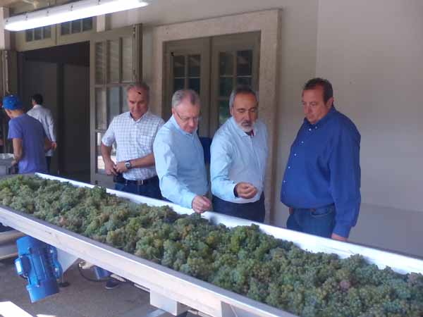 O delegado territorial da Xunta en Pontevedra, José Manuel Cores Tourís, visitou o pasado venres a adega Lagar de Cervera no Rosal, acompañado dos responsables da firma así como do alcalde da localidade, Jesús María Fernández Portela, co obxectivo de supervisar cómo evolucionan os traballos de vendima.