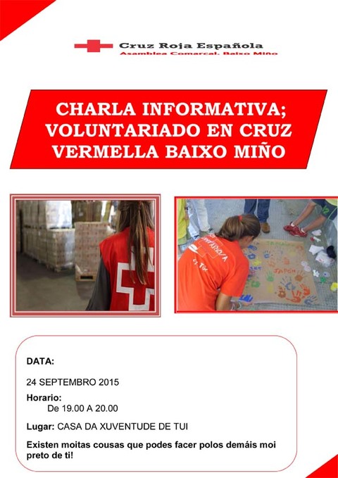 Cruz Roja en Baixo Miño desarrollará el próximo 24 de Septiembre a las 19.00 en la Casa da Xuventude de Tui una sesión informativa sobre el voluntariado en esta institución, detallando aquellas actividades que se realizan en Tui y alrededores. El objetivo de esta sesión es promocionar el voluntariado como una vía de participación social a la que es muy fácil acceder.
