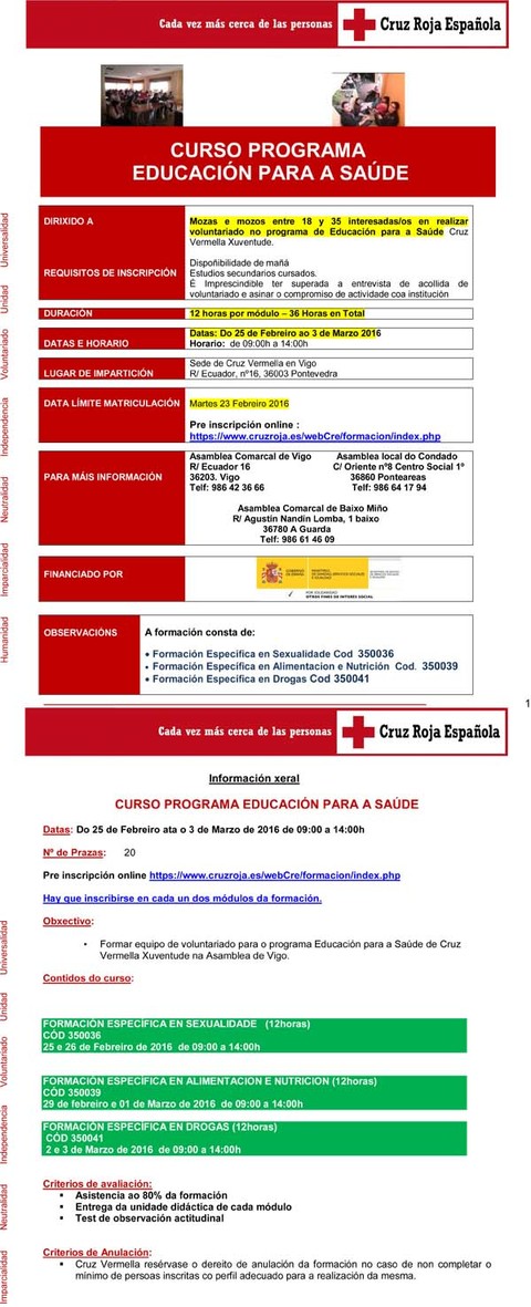 Esta semana se ha abierto el plazo de inscripciones para este curso de formación del programa de Educación para la Salud que se realizará en Cruz Roja de Vigo y al que podrán asistir jóvenes de Vigo, Ponteareas y Baixo Miño.