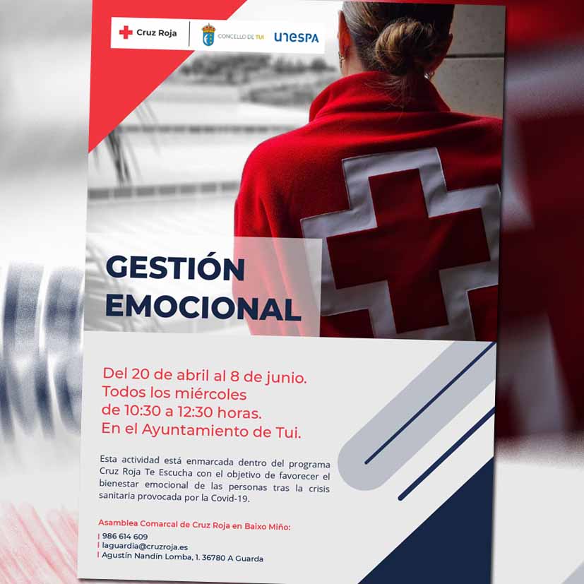 Todos os mércores dende o 20 de Abril ata o 8 de Xuño, en horario de 10.30 a 12.30, realizarase un novo obradoiro de Xestión emocional. O obradoiro terá lugar nunha aula de instalacións pertencentes ó concello de Tui. Esta actividade enmárcase dentro do programa “Cruz Vermella te escoita”, que ten como obxectivo favorecer o benestar emocional das persoas e que se puxo en marcha trala crise provocada pola Covid-19.