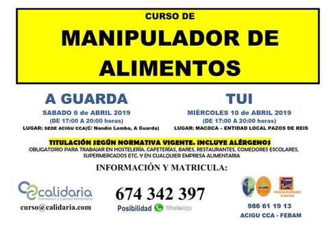 Curso de Manipulador de alimentos el 6 de abril en A Guarda y el 10 de abril en Tui