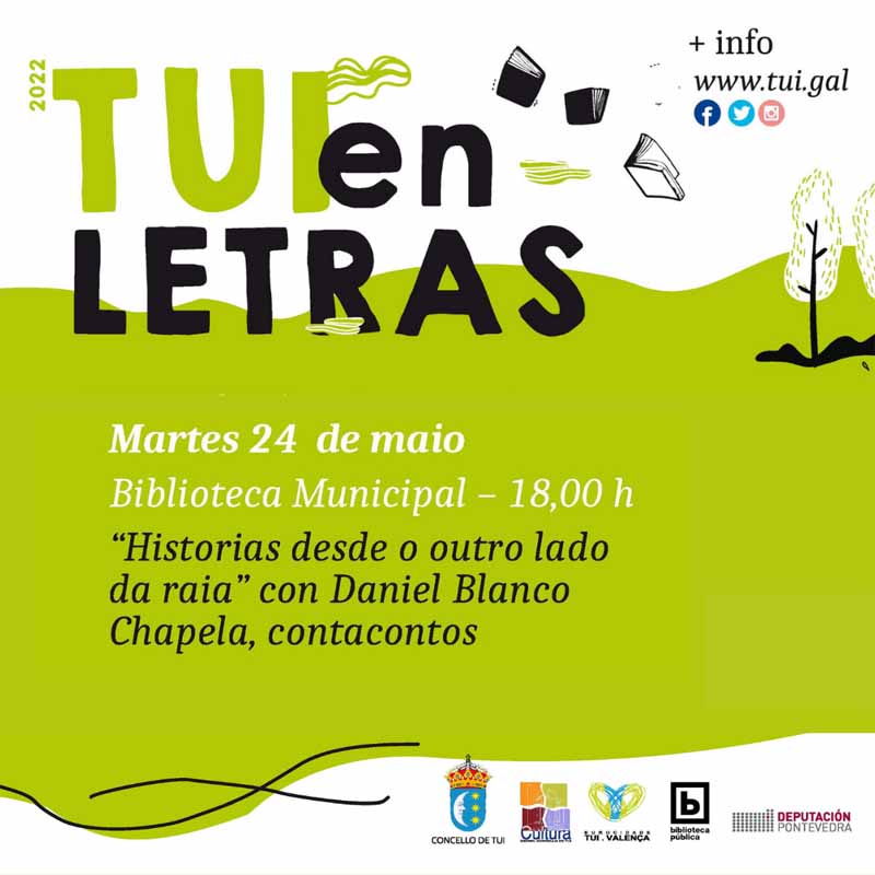 O martes 24 de maio, continúa na Biblioteca Municipal de Tui o programa de actividades “Tui en letras” que abrangue os meses de maio e xuño. Mañá martes, ás 18 h será a quenda de Dani Blanco co contacontos “Historias desde o outro lado da raia” dirixido a nenas e nenos de 3 a 8 anos. A entrada é libre ata completar a capacidade da sala.