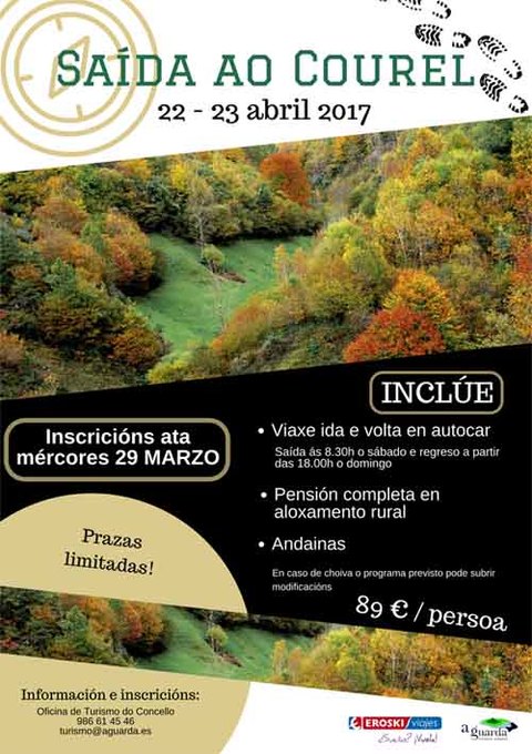 Tras as boas experiencias dos pasados anos coas andainas impulsadas dende o Concello da Guarda, para o vindeiro mes de abril este organiza conxuntamente con Eroski Viajes unha saída de fin de semana ao Courel na que se poderá desfrutar da gran riqueza natural e paisaxística desta Serra luguesa.