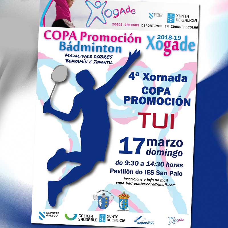 El domingo, 17 de marzo, organizamos en casa a partir de las 9:30 horas, en el pabellón del IES San Paio de Tui, la 4ª Jornada de la Copa Promoción de Bádminton Xogade, en categorías dobles benjamín e infantil, donde participarán 26 deportistas de nuestro club.