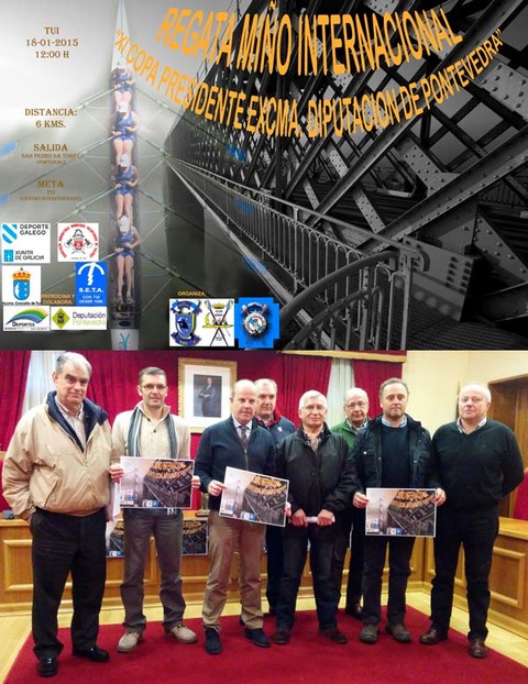 Un total de 12 clubs galegos e portugueses, que sumarán 300 remeiros, daranse cita este domingo na Regata Miño Internacional Copa Presidente da Deputación. Esta proba deportiva foi presentada esta mañá na Casa do Concello, por parte alcalde de Tui, Moisés Rodríguez, o concelleiro de Persoal, José Ángel Villaverde e os responsables dos clubes tudenses organizadores da proba deportiva, Manuel Landeira, José Prada, Francisco Javier Álvarez e Manuel Ángel González. Tamén asistiu o presidente da Federación Galega de Remo, Manuel Seijas, e José Luís Méndez, o primeiro presidente do Club Remo do Miño.