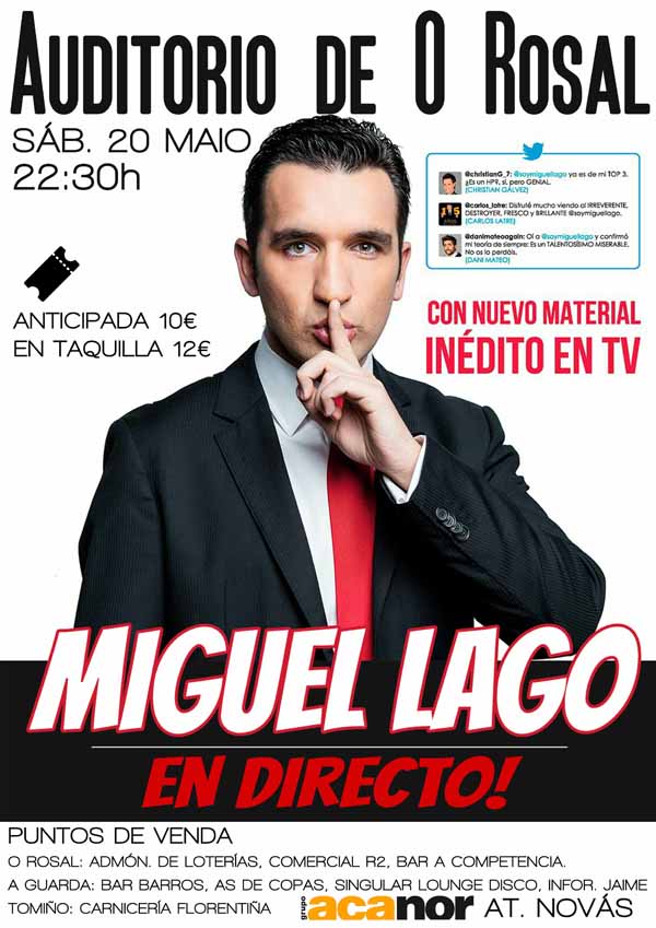 El cómico vigués Miguel Lago visita O Rosal el 20 de mayo