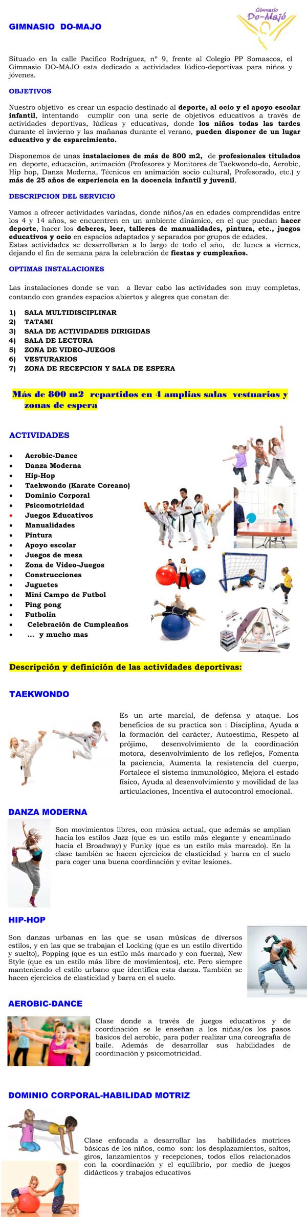 El Gimnasio DO-MAJÓ está ubicado en la c/Pacífico Rodríguez, 9 1º dedicado a actividades lúdico-deportivas para niñ@s y jóvenes.
