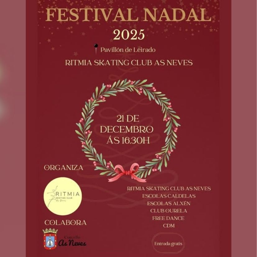 El domingo 21 de diciembre, a partir de las 16:30 horas, el Pabellón de Leirado, en As Neves, se llenará de música, movimiento y espíritu navideño con la celebración del Festival de Navidad 2025 del Ritmia Skating Club As Neves, una cita destacada dentro del calendario deportivo y cultural del municipio.