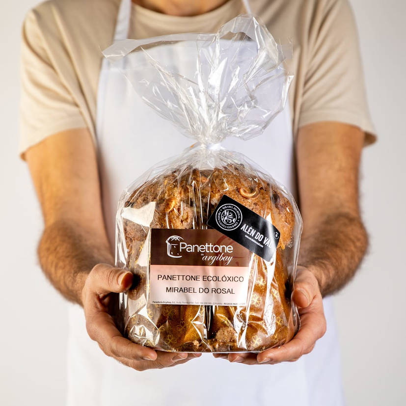 Se trata de un panettone singular, elaborado de manera tradicional, de auténtica masa madre y con materias primas ecológicas y de alta calidad, pero con un toque innovador al incorporar en su interior el auténtico mirabel de O Rosal, que aportará aromas y sabores singulares de esta exquisita fruta, todo ello acompañado con chocolate blanco caramelizado. En definitiva, se trata de un panettone que sorprende por su exquisitez a los amantes de este dulce navideño.