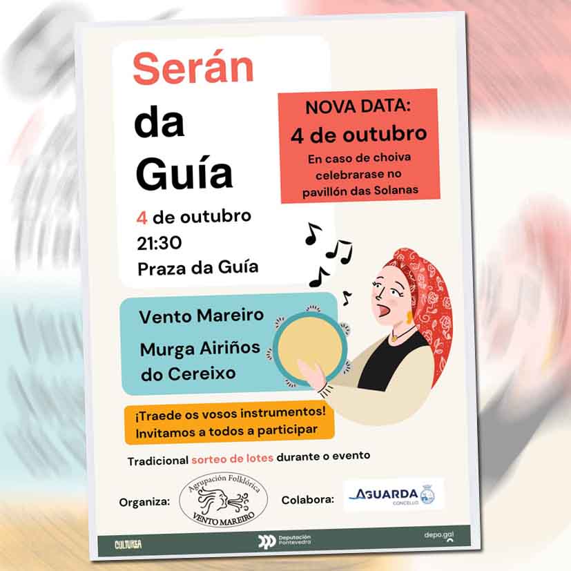 La Agrupación Folklórica Vento Mareiro organiza este sábado 4 de octubre una nueva edición del Serán da Guía, que dará comienzo a las 21:30 horas en la Praza da Guía de A Guarda. El evento, que tuvo que ser suspendido a finales de agosto debido a la lluvia, contará con un programa que combina tradición, música en vivo y participación popular.