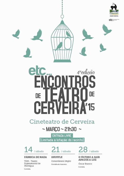 A edição de 2015 arranca a 14 de março, com ‘Fábrica de Nada' pelo Teatro Experimental de Mortágua; segue dia 21 com ‘Shuffle' interpretado por Instantâneos Impro e, para encerrar, dia 28, ‘O Último a Sair Apague a Luz', por Óscar Branco. Os espetáculos sobem ao palco do Cineteatro às 21h30, com entrada livre, limitada à lotação do recinto.