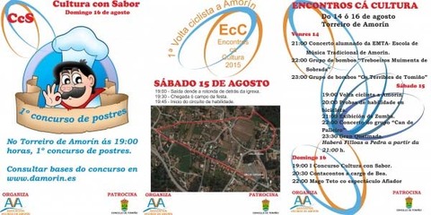 Nova edición de Encontros cá Cultura en Amorín dende o 14 ó 16 de agosto no torreiro. Teremos concertos, contacontos, maxia, volta ciclista a amorín, exibición de samba, etc…. Non faltes, a diversión está asegurada e o paladar disfrutará cos exquisitio postres que se presenten a concurso.