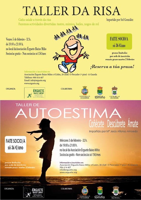 Ábrese o prazo de inscrición para participar nos obradoiros de "Autoestima" e "Taller da Risa" que organiza a Asociación Érguete Baixo Miño xunto coa colaboración dos Concellos de A Guarda, Tomiño e O Rosal.