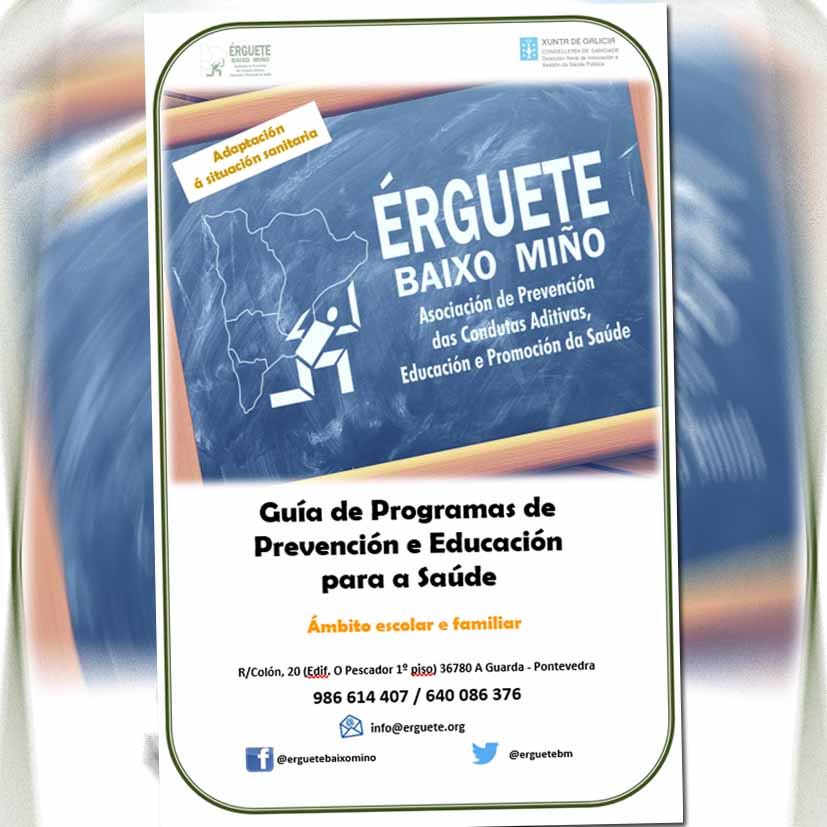 Érguete Baixo Miño retoma un ano máis, o traballo nos centros educativos neste curso escolar presentando unha breve guía cos Programas de Prevención e de Educación para a Saúde que ofrece gratuitamente nas escolas de A Guarda, Tomiño, O Rosal e Oia, adaptándonos á actual situación sanitaria.