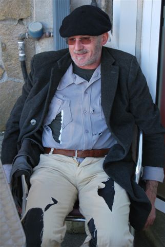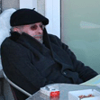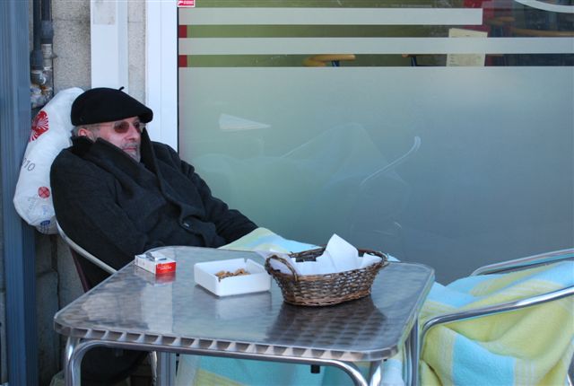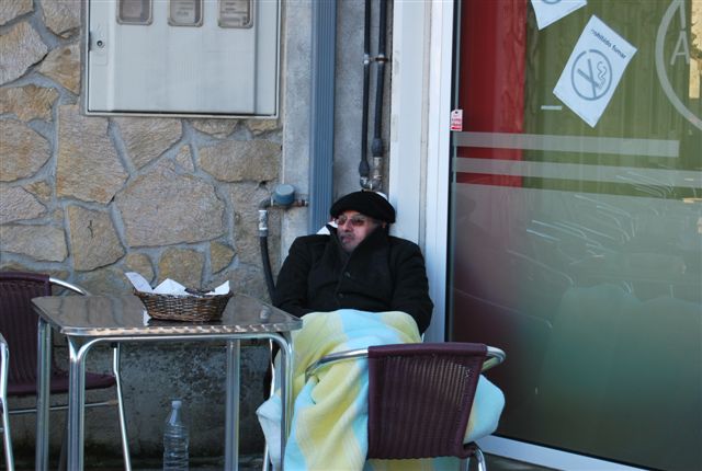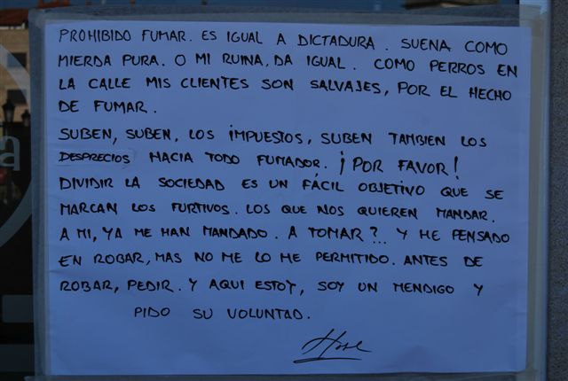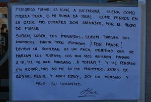 Una pancarta colocada en la fachada de su establecimiento, explicaba el origen de su protesta contra la Ley Antitabaco, que le hace permanecer sentado fuera de su establecimiento durante toda la jornada.