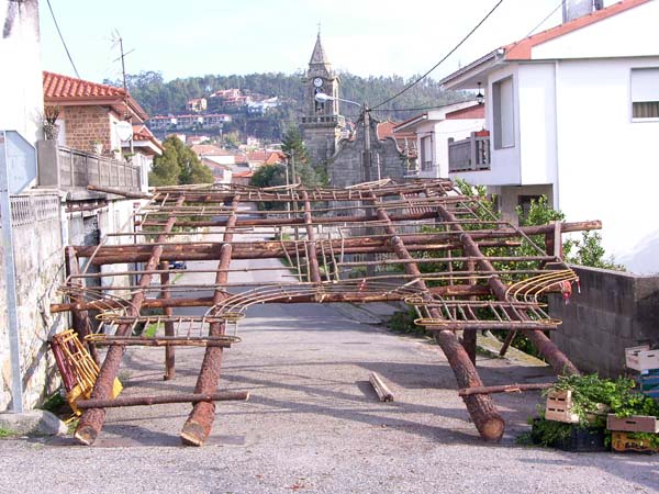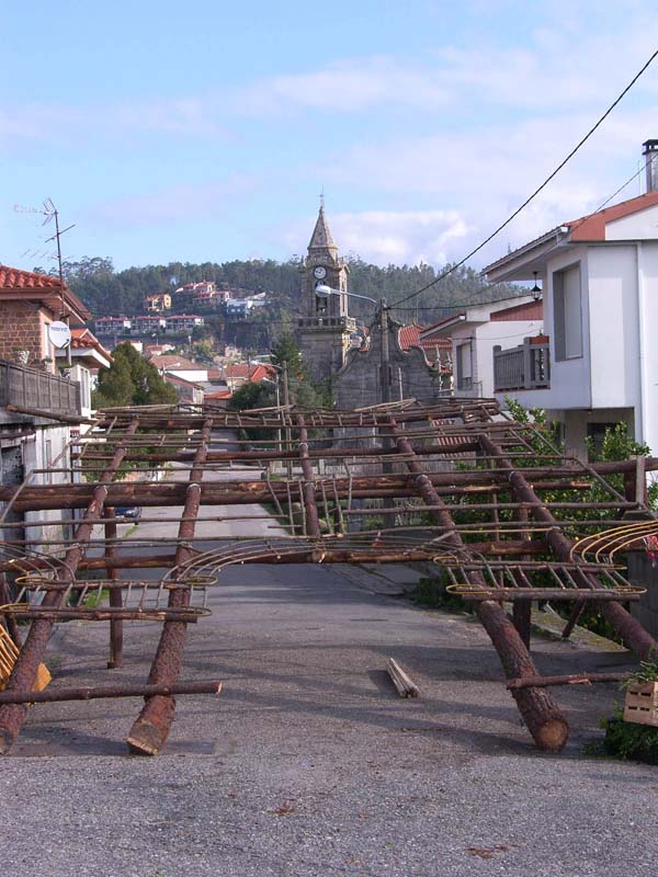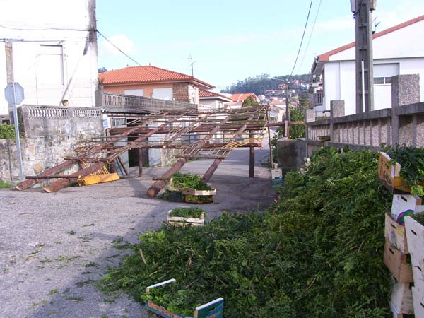 Os veciños colaboran na realización deste tradicional arco, que se forra con follas e flores e se levanta dando comezo ás Festas.